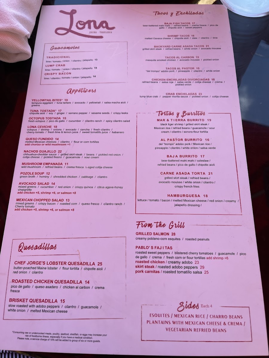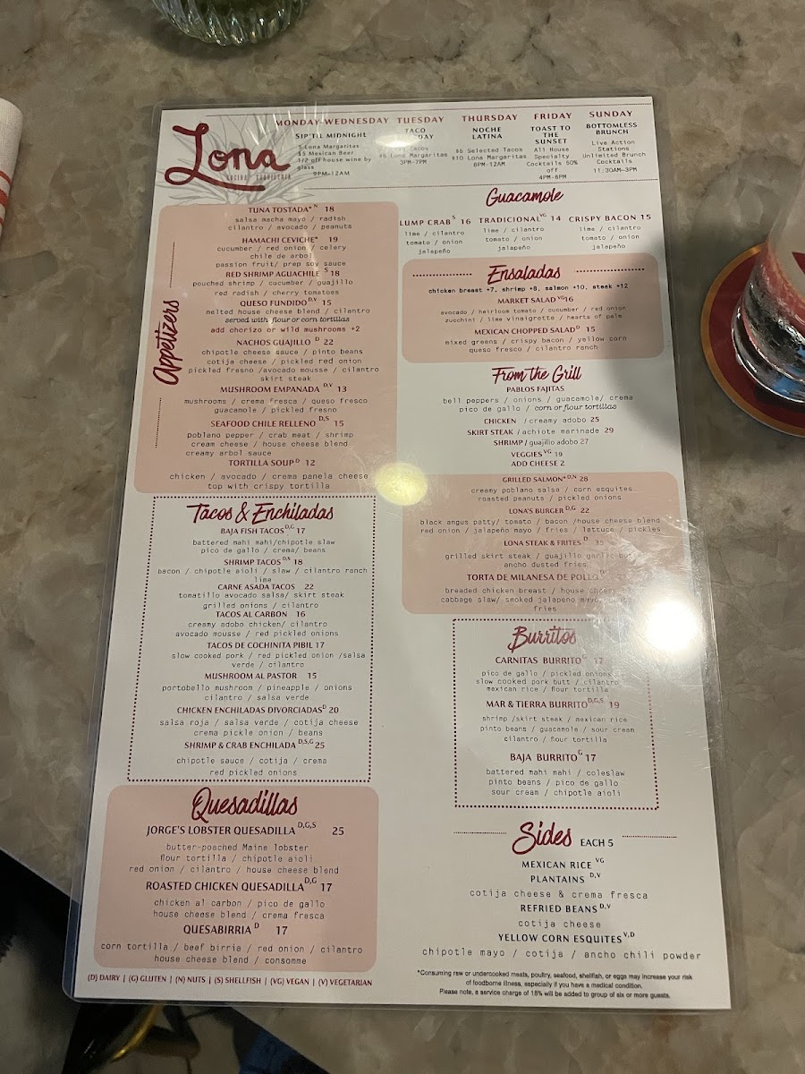 Step into Lona and feel the energetic vibe immediately. With an extensive menu that appeals to all tastes, the establishment's standout dishes include their famed fajitas, mouthwatering guacamole, and refreshing margaritas. Guests have shared their delight in specific offerings, such as the indulgent lobster burrito and the ever-popular Baja fish tacos. While reviews suggest that some dishes are hit-or-miss, the consensus is clear: the smoky salsa and the steak and fritas are unrivaled stars that warrant a visit on their own.